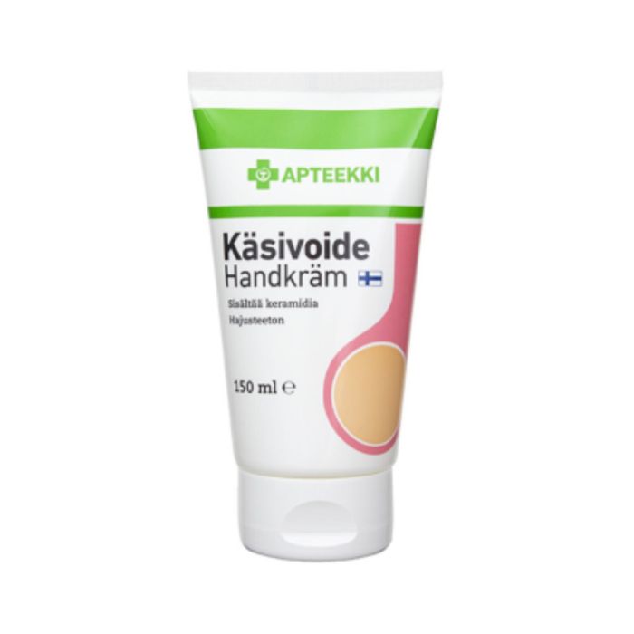 Apteekki käsivoide imeytyy hyvin eikä jätä tahmeaksi. Käsivoide sisältää ihon kosteutta ylläpitävää keramidia, kosteuttavaa glyserolia ja rauhoittavaa allantoiinia. Hajusteeton ja parabeeniton.