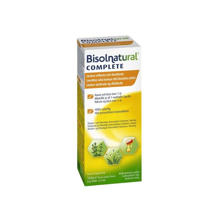 Bisolnatural Complete lievittää sekä kuivaa että limaista yskää. 100-prosenttisesti luonnollinen, hyvänmakuinen siirappi sopii sekä aikuisille että lapsille, 1-vuotiaista alkaen. Bisolnatural Complete -siirappi sisältää ainutlaatuisen yhdistelmän luonnollisia ainesosia, jotka ovat peräisin heinäratamosta, timjamista ja hunajasta. CE-merkitty lääkinnällinen valmiste.